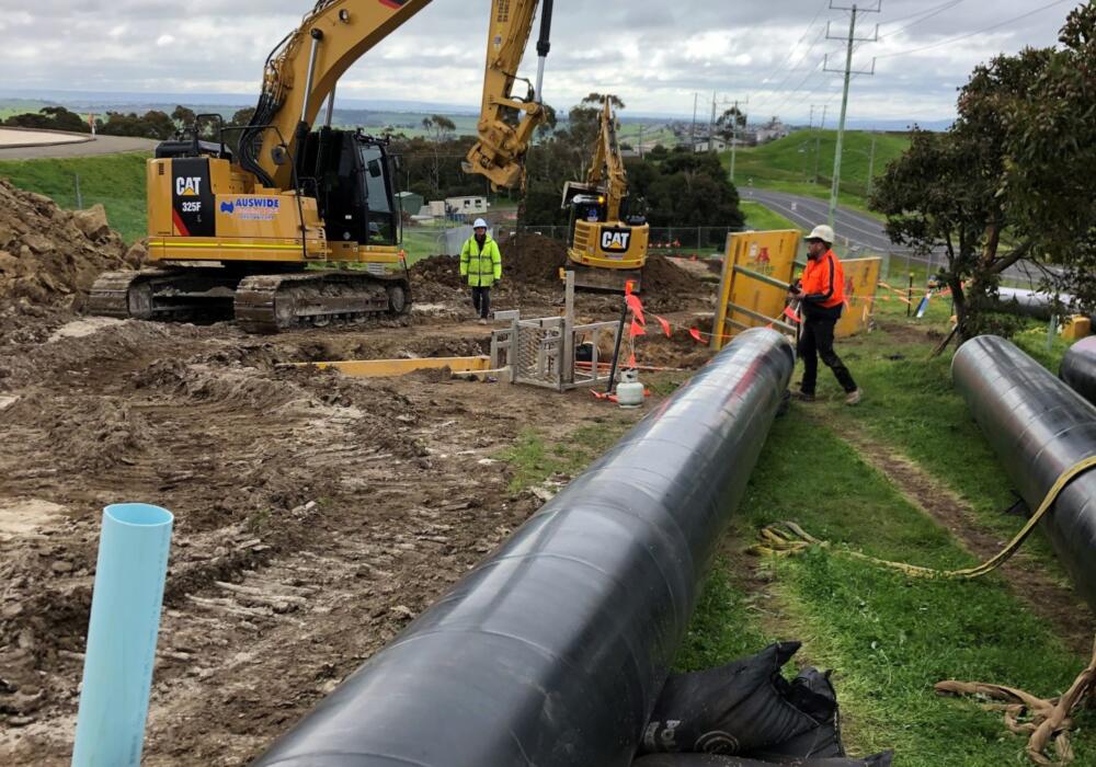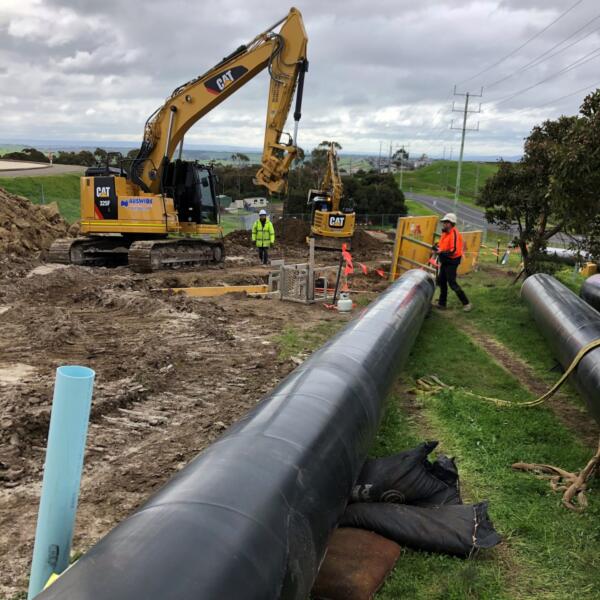 Auswide Plumbing installed 660mm and 711mm Sintakote MSCL pipe and provisions for new electrical services at the pump station site in Lovely Banks and also assisted with civil works at the Montpellier site which included 100 metres of 660 MSCL tying into the 1124mm Lovely Banks feeder main.